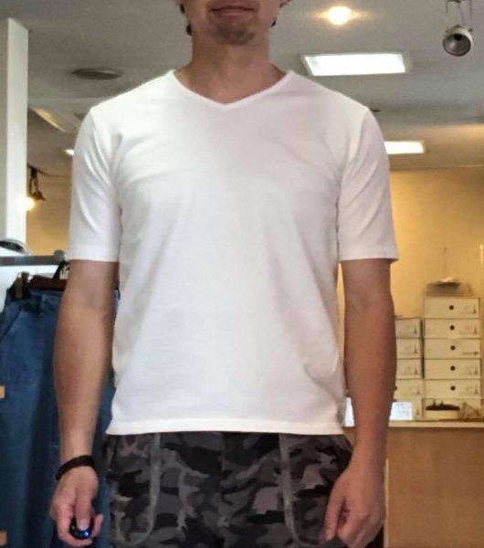 デザインの特徴としては、肩幅がしっかりあって、着丈短め袖長め(半袖にしては)の身幅細め。そしてこだわりの生地は、肌触りと着心地を追求した綿95%ポリウレタン5%のイタリア製です。ポリウレタンという伸びる素材を含んでいるので、綿100%のTシャツと比べると驚くほど伸びます。着た時に、身幅ぴったりでも窮屈さはなく、動きを邪魔することはありません。