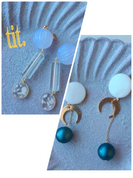 ク〜ル!涼しげなピアス(になるのかな?)ですね〜。写真左の一番下に付いてる丸の中に入っているのは、本物の小さな小さな貝殻なんですよ。なんと浜辺に拾いに行ったそうです!