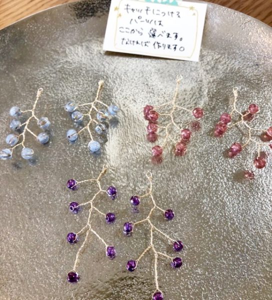 好きな色のパーツがつけられるというセミオーダー的なものがあったり、お客さまのリクエストに応えてその場でワイヤー捻ってピアスを作ったり。
