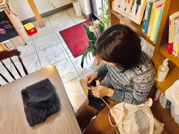 話を戻して、彼女が編み物をする横で私は自分の仕事をしながら、ああこれは!と思い出したんです。お店の一部に商品を置かないフリースペースを作ろうと思った時のことです。このフリースペースは、お客さまやお友達と一緒にくつろいでお話できる場所にしたかったのはもちろん、こんな風に1人の時間を楽しみたいお客さまやお友達の憩いの場になればいいなとも思っていました。それは私が1人を楽しむ場が欲しかったからなんでしょうが、そんな風にフリースペースを使ってくれる人がいなかったのですっかり忘れていました。そうだったそうだった!こんな風にも使ってもらいたかったんだー!静かにひとり、自分の世界に没頭してもらって全く構わないんです。私もお構いしませんのでー。