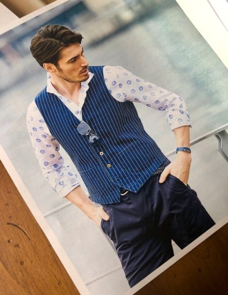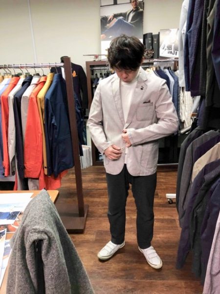 さて、春から夏にかけての、セットアップにもなる(要はスーツとしても着られる)ジャケットとパンツを中心に見せてもらいましたが・・これがどれもカッコよくて!どれをどんな風にお店に置いたらいいかと、担当の人を交えてあーでもないこーでもないと話しながら、あっという間の楽しい時間でした。どんなものを見せてもらったか、一部を写真でご紹介しますね〜。