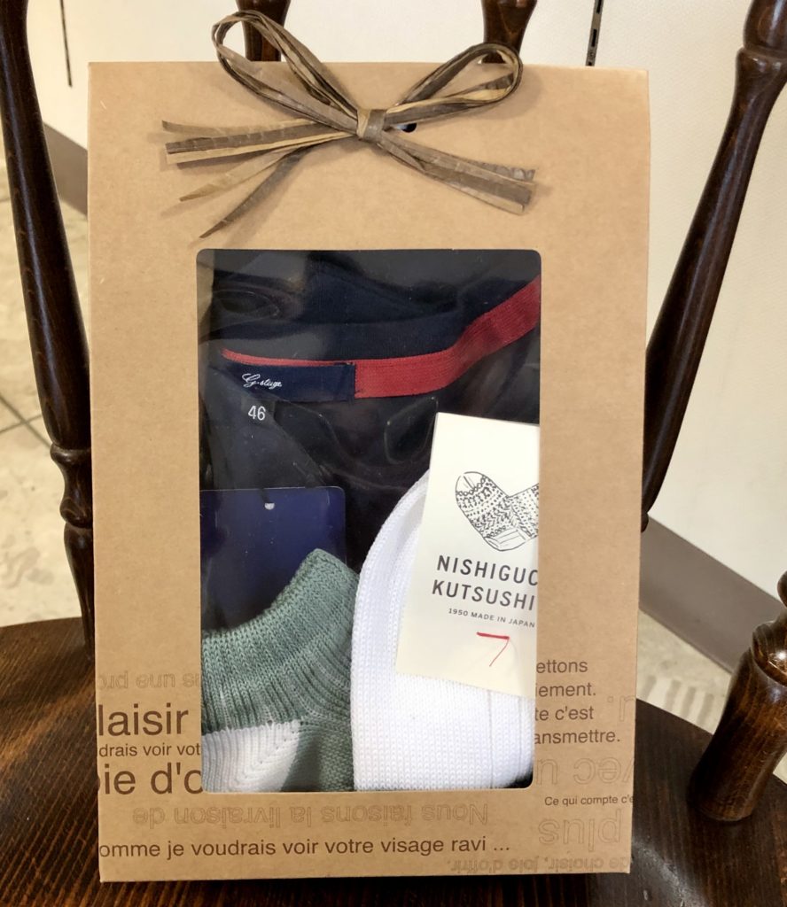 ラッピングも承ります。写真のTシャツはボーダーTシャツではないんですが、アンクルソックスとセットでこんな感じに。