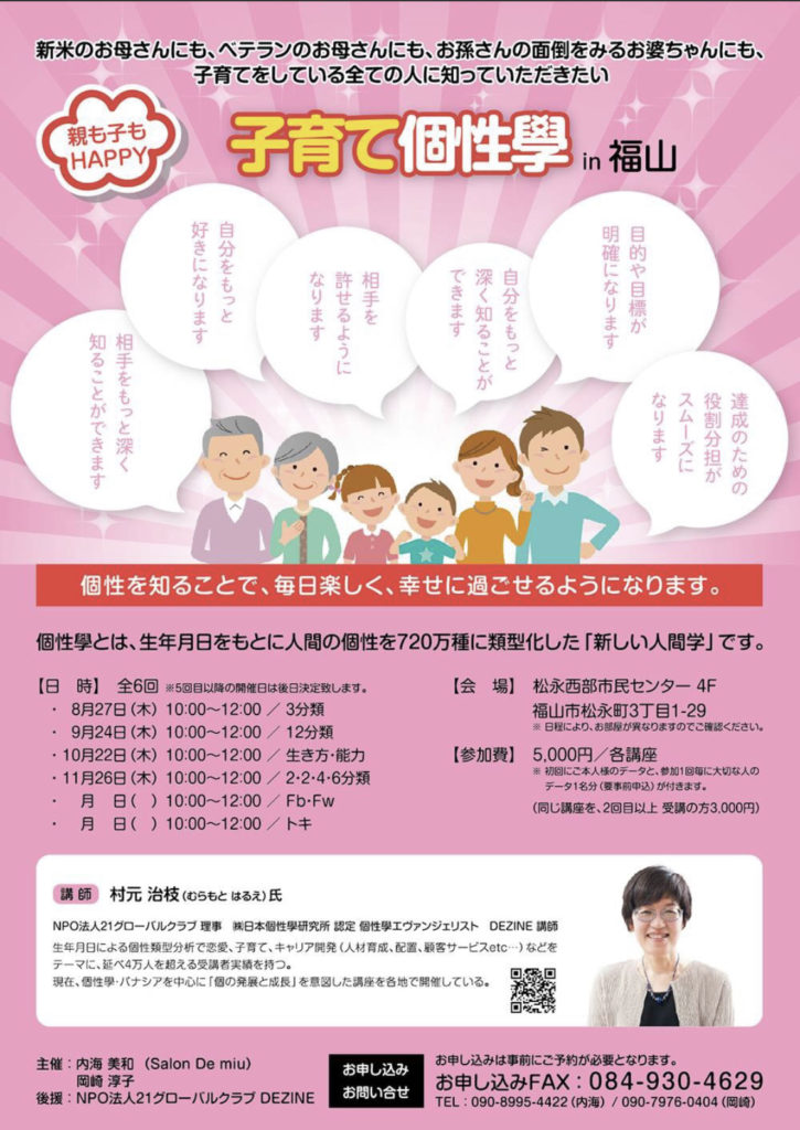 「第5期子育て個性學in福山 8月より開講します」