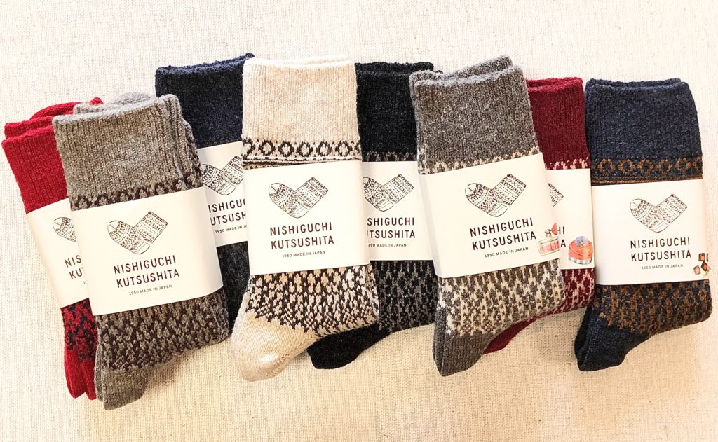 そんなメーカーさんと、ひょんなことからお取り引きさせてもらうことができ、その靴下達は当店でも人気を博しています。その中でも冬の一番人気の「ウールジャカードソックス」を今回の企画の靴下に選びました。履いた瞬間もっちりあったかで、ご自分用にご購入された方はかなりの高確率でリピートされます。耐久性にも優れているので少々のことではヘタりません。