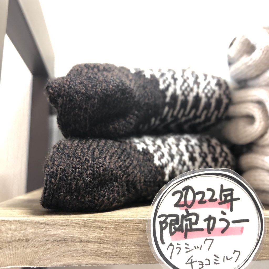 暖かくてかわいいウールの靴下には毎年、西口社長の思い出の景色から着想を得た、その年だけに作られる限定カラーがあります。2022年の限定カラーは「クラシックチョコミルク」