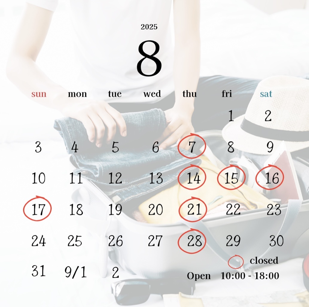 8月は、定休日の木曜日と、15日(金)〜17日(日)にお休みします。