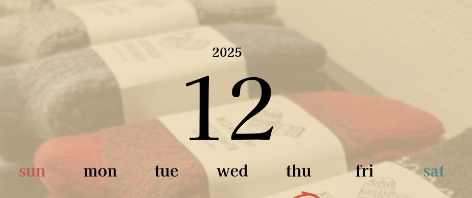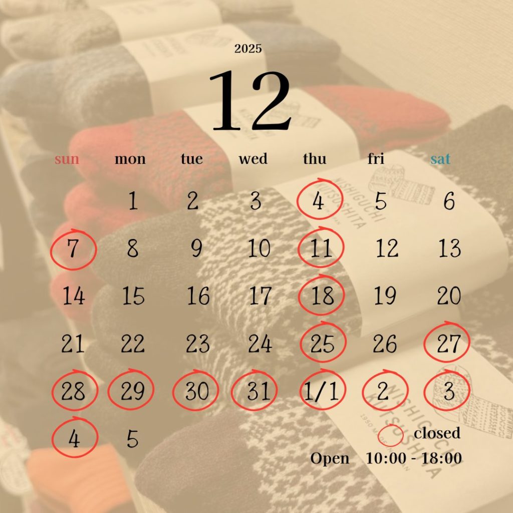 12月のお休みは、定休日の木曜日と7日(日)、年末年始休業は27日(土)〜1/4(月)です。