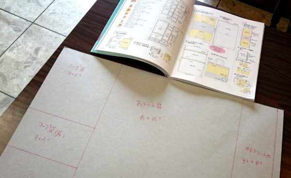 お店の中で、本を見ながら型紙を作り、
