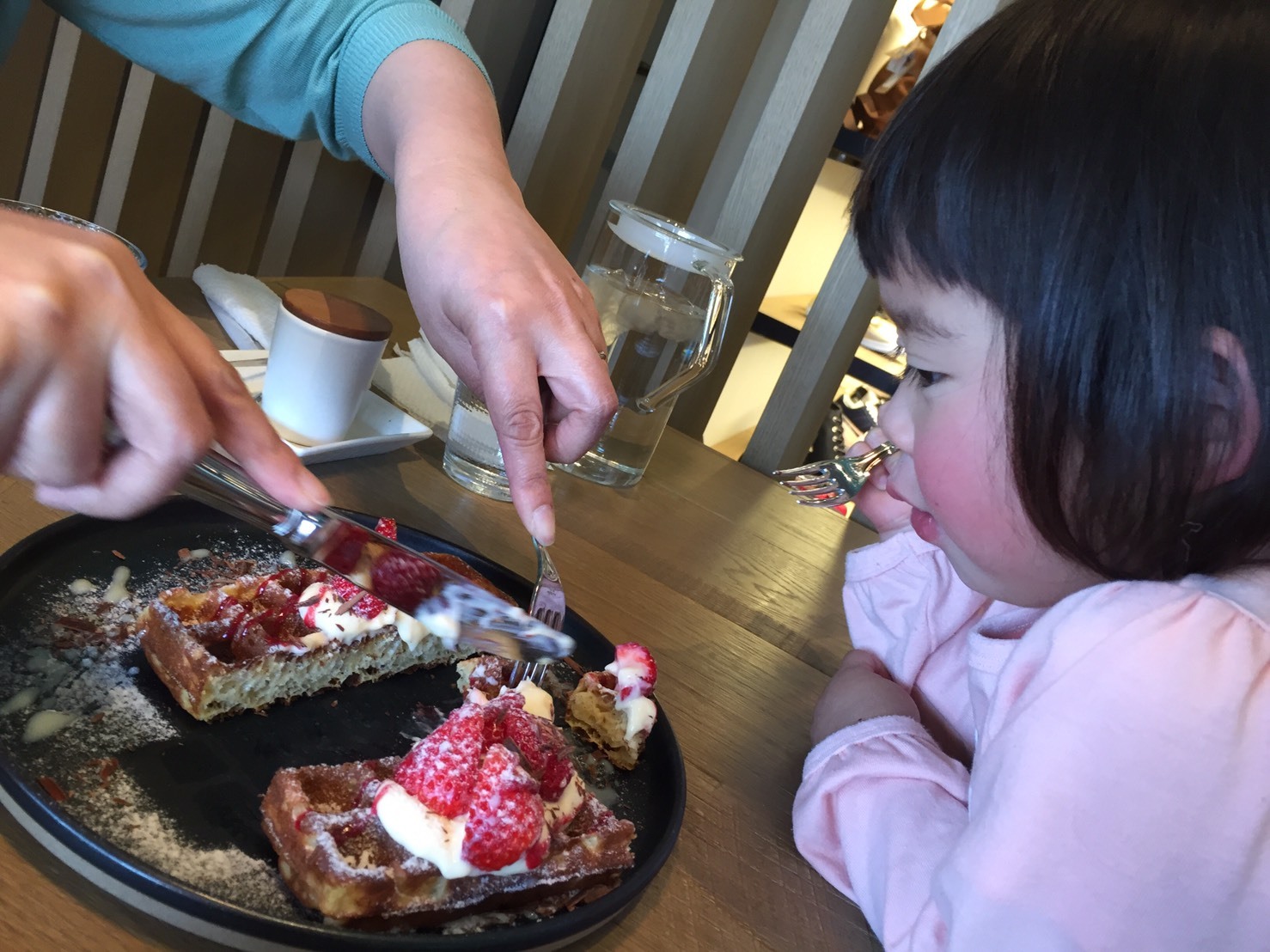 ワッフルを見つめる娘(3才)の眼差しが真剣すぎます(笑)