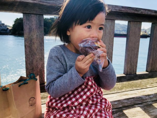 まずは腹ごしらえ。自分で選んだマフィンにかじりつく娘。