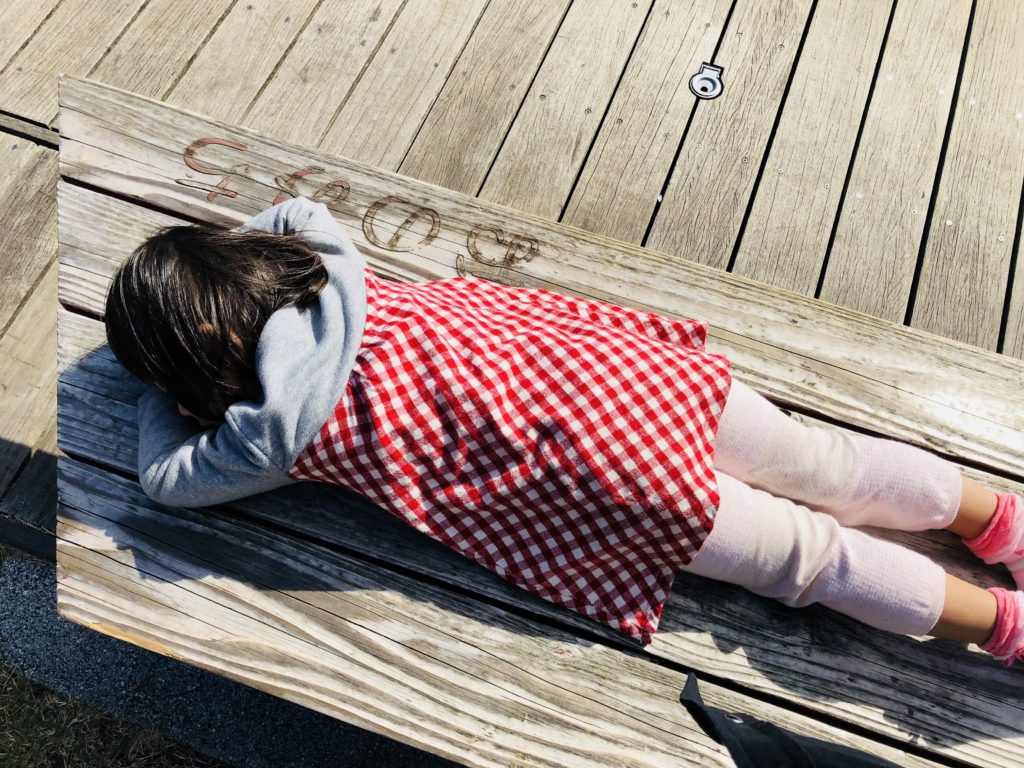お腹いっぱいで眠くなったのか?ポカポカ暖かいのでベンチにごろん。あのーーーかーちゃんのお楽しみはーー?と、どうにかこうにか数軒のぞいたところでお昼になって時間切れ。娘の帽子をやっとこさ買って、後ろ髪を引かれる思いで帰りましたとさ。