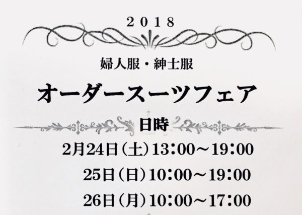 先日お伝えしました、「レディーススーツオーダー会」の日程が決まりました。レディースのオーダー会をやります!との発表後、数人の方に「いつなの!?」と詰め寄られ嬉しい悲鳴を上げたとかあげなかったとか。