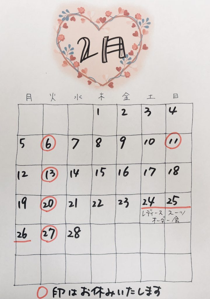 当店、基本的には日曜日がお休みなんですが、今津小学校の制服の採寸受注が始まるので、2月(3月も?)は、11日以外の、4・18・25の日曜日は営業することに決めました。代わりに6・13・20・27の火曜日にお休みします。カレンダーにすると、こんな具合です。