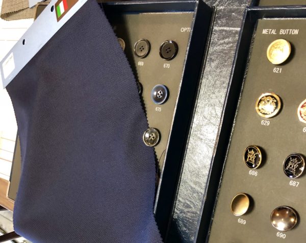 次に生地を選びます。「紺色」ひとつにしても、暗め明るめ、光沢や織模様のあるなしなど様々。悩むよね〜。この後、裏地やボタン、ステッチ糸の色などなど選択に次ぐ選択!