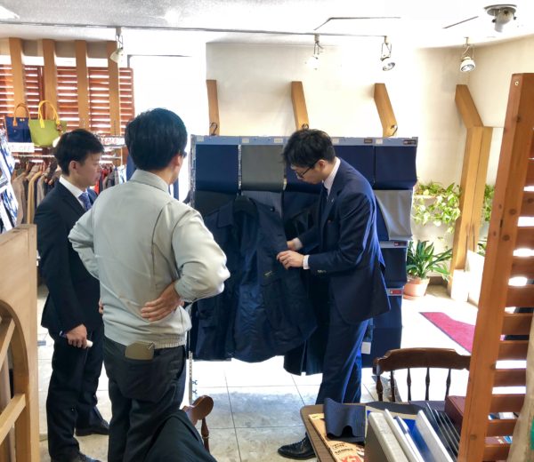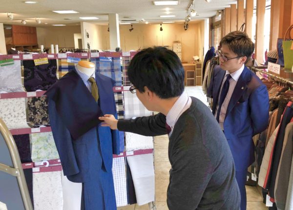 まず、何を作るか決めます。スーツ・ジャケット・パンツ・シャツ・・・写真はスプリングコートを見てもらっているところ。