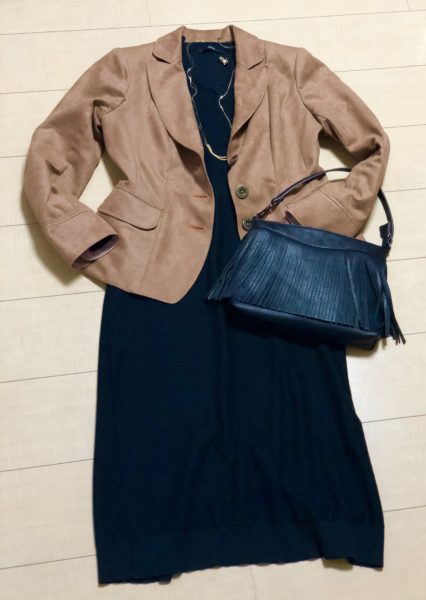 ハイゲージ(目が詰まっていて表面がサラッとしている)のニットワンピースにジャケット、靴は黒のエナメルパンプスを合わせました。