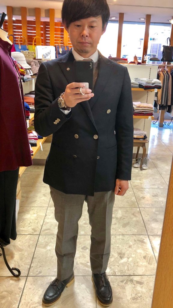 ジャケットにパンツ、いわゆる「ジャケパンスタイル」です。隠れてて見えませんが、ネクタイはニットタイをしています。